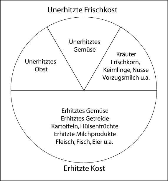 Zur Frischkost zählen alle in unerhitzter Form verzehrsfähigen und genießbaren pflanzlichen und z. T. auch tierischen Lebensmittel. Als Orientierung gilt, dass etwa die Hälfte (ein bis zwei Drittel) der Nahrungsmenge als unerhitzte Frischkost verzehrt werden sollte (je nach Vorliebe, Bekömmlichkeit und Jahreszeit). Für empfindliche oder ältere Menschen kann ein geringerer Frischkostanteil empfehlenswert sein. Der größte Teil hiervon sollte frisches Gemüse und Obst sein, der verbleibende Teil Kräuter, unerhitztes Getreide, Keimlinge, Nüsse, Ölsamen, Ölfrüchte, Kaltgepresste, nicht raffinierte Öle, Vorzugsmilch, unerhitzte Sauermilchprodukte u. a. (s. Abb. Empfehlung zur Aufteilung von unerhitzter Frischkost und erhitzter Kost).